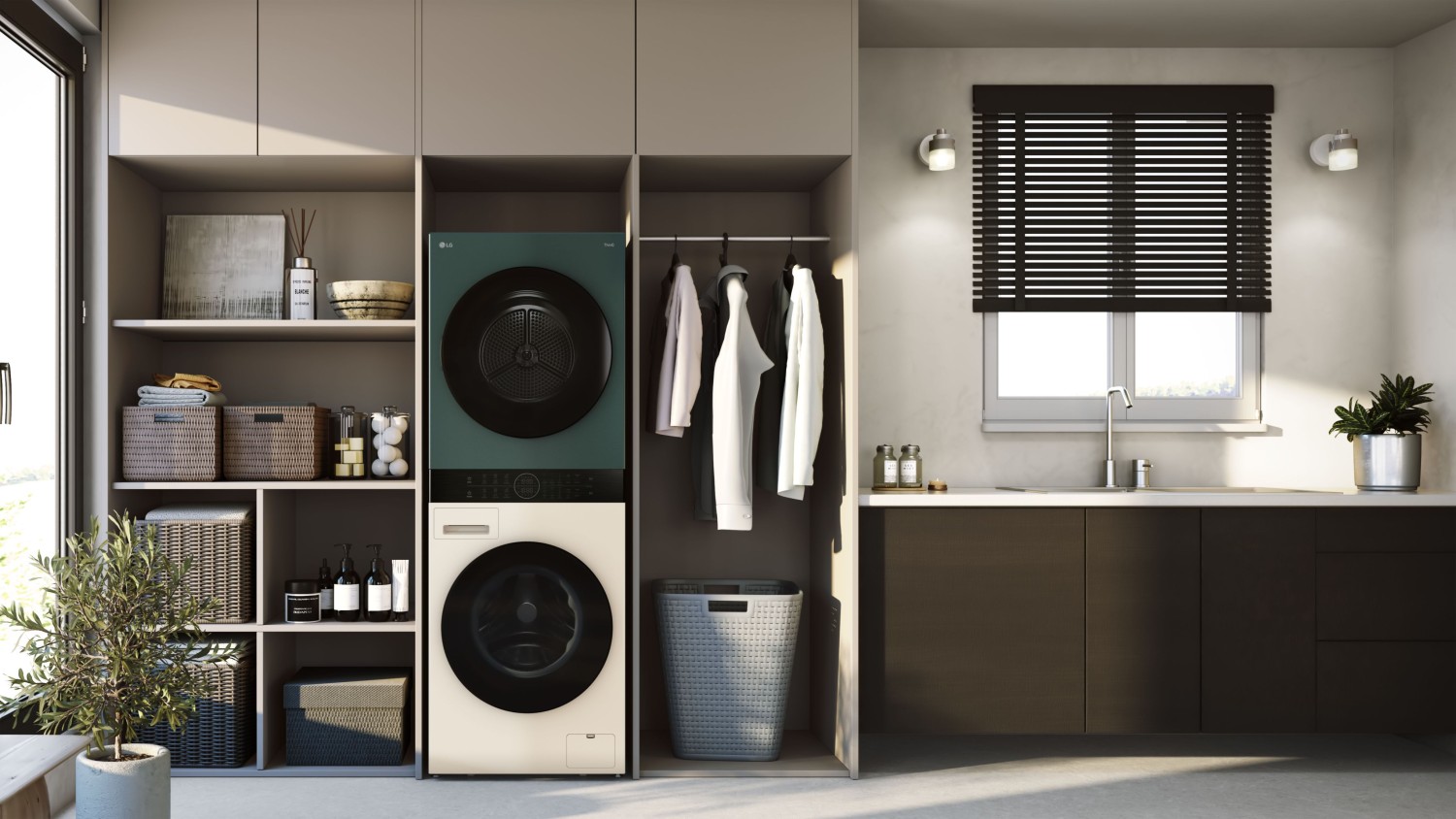 Der LG WashTower in den neuen Farbvarianten Grün/Beige und Weiß ist ab sofort in Deutschland für jeweils 2.899 Euro erhältlich.