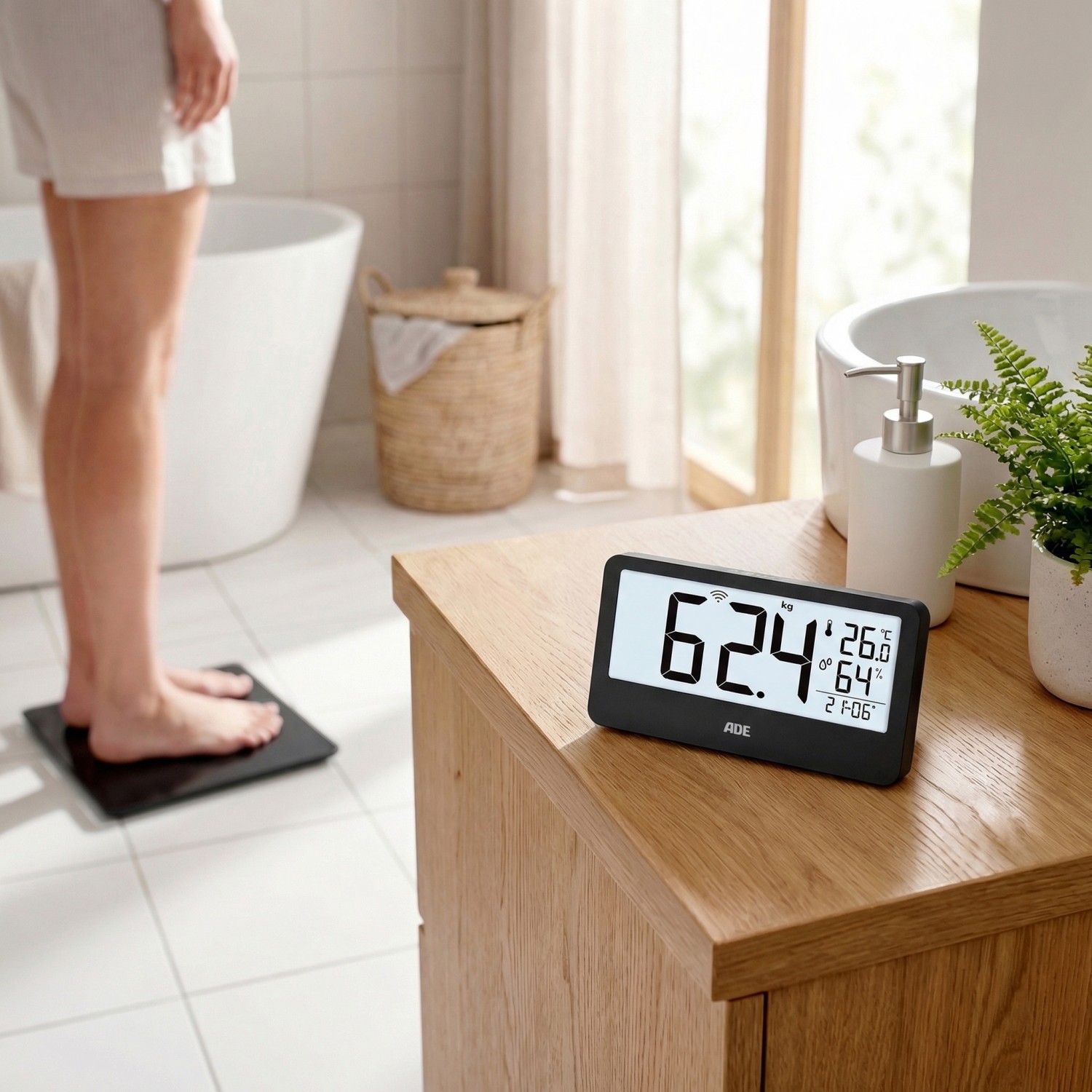 Die digitale Personenwaage Ronja von ADE kombiniert die Waage an sich mit einem externen Display mit Funkübertragung, das eine komfortable Nutzung ohne Bücken ermöglicht. Dadurch eignet sich die Waage ideal für unterschiedliche Nutzergruppen, etwa Senioren, Schwangere oder Menschen mit eingeschränkter Beweglichkeit. Neben der Anzeige von Gewicht und Uhrzeit bietet das Gerät zusätzliche Funktionen wie Temperatur- und Luftfeuchtigkeitsmessung oder auch eine Weckfunktion.